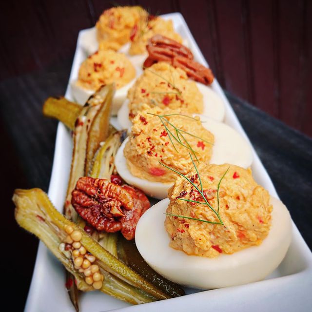Wisteria's menu offers traditionally Southern eats, from the beginning Hill found himself reinventing the types of foods he grew up with to suit the taste of his family and friends. "I wanted to make food for people I love and knew they would enjoy," he says of Wisteria's early menu. His signature black-eyed pea hummus with sweet potato chips was born from the need to satisfy modern cravings while remaining within the realm of Southern ingredients and food values. Entrees of pan-seared pork belly with poached pear, dried cherries, balsamic-candied walnuts and a port wine-and-tupelo honey reduction are testament to tradition, yet offer a new angle, and the kitchen's pimento cheese deviled eggs with pickled okra and spiced pecans combine down-and-dirty Southern flavors with the up-turned pinky of refinement.